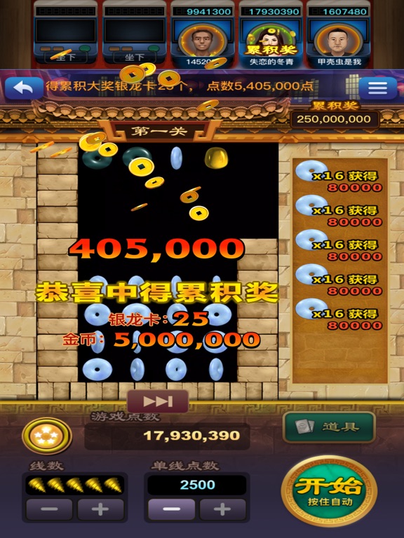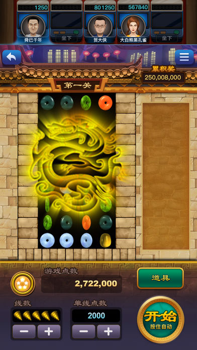 目前大热的连线消除街机游戏,100%真机程式!在经典玩法的基础上,加入道具系统,玩法多样、大奖不停! 免费的龙珠游戏,增加更多奖励,更刺激~ 〔游戏介绍〕 ◎ 玩家可以选择1-5条线进行游戏,每条线最低投入10点数,最高投入2000点数。 ◎ 游戏共分三关,分别在4x4、5x5、6x6的方形区域内随机派发宝石,其中还包括一种特殊钻头,钻头可消除砖墙上的砖块。 ◎ 系统在游戏中随机派发相应数量的宝石,若有符合游戏规则的宝石连线,即可获得相应的游戏点数。 ◎ 在每一关中累计得到15个钻头图案,则进入下一关。 ◎ 完成三关游戏将进入 “龙珠游戏”,在龙珠游戏中可免费获得金币、钻石、礼券、道具卡奖励。 〔联系我们〕 官方微信:lhdb777 客服QQ:2133248847