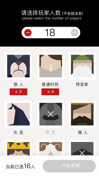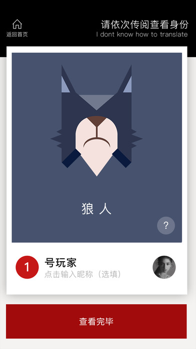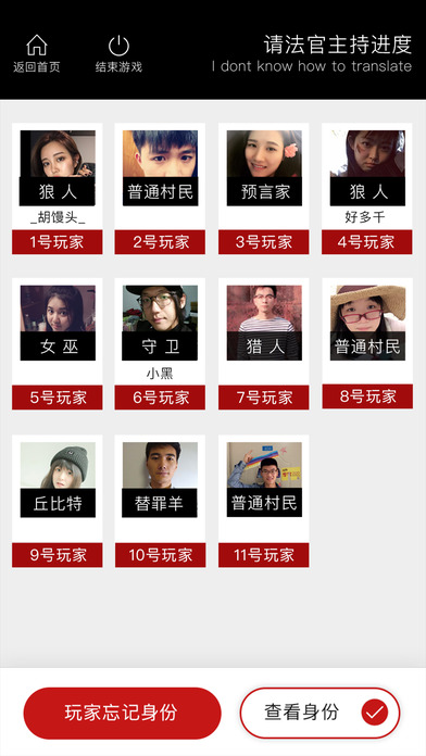这款工具是用来代替卡牌的! 这款工具是用来代替卡牌的! 这款工具是用来代替卡牌的! 重要的事情说三遍!!! 请大家玩的时候开启摄像头权限,这个功能很重要,不骗你! 不加广告不收费,就是方便大家随时开撕! 游戏现在有12个角色,大家需要玩其他角色的,可以发挥想象力!把某一个角色脑补成另外一个!哈哈哈哈哈~ 第一个页面 - 选择人数,分配角色; 第二个页面 - 传递手机,查看身份; 第三个页面 - 裁判判定,记录局势。 感谢泽哥、千千、小旻和小刘同学对本作的大力支持~