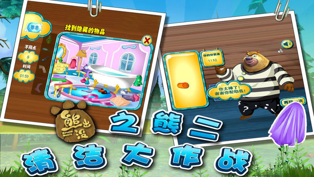 熊大和熊二终于忍受不住自己的又脏又臭了,他们今天准备大搞清洁,不过他们忘了清洁工具放到哪里去了,你帮帮他们找到他们想要的清洁工具吧! 然后再帮他们一起完成这场清洁大作战吧!