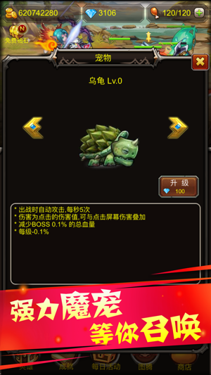 挂机之王震撼来袭,源于经典,又不断创新的点击玩法,带有RPG冒险元素,让你点到爆。 游戏采用经典的魔兽题材,诸多耳熟能详的超强BOSS让你重温昔日梦想。史无前例的懒人玩法,睡觉也能收金币, 战斗升级根本停不下来!还有诸多英雄等你招募! 产品特点: - 魔性挂机,根本停不下来的挂机游戏! - 休闲的挂机模式,即使下线照样有金币拿! - 升级点击等级,动动手指也能杀怪哦! - 招募升级新的英雄,英雄搭配杀怪不累! - 宠物系统,都带自动点击,每个宠物都有自己的特殊能力! - 副本系统,普通和精英副本产出装备材料和灵魂石。 - 装备系统,装备合成和进阶,神装等你拿! - 英雄进化,集齐灵魂石进化…