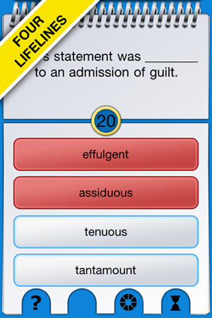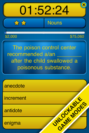 Play this game show-style word game to improve your verbal skills or master tests such as the SAT or GRE! With over 2500 questions on over 1000 vocabulary and spelling words, WITS Vocab will help get your brain juiced up. This game is targeted to ages 14+ and especially to those studying for the P…