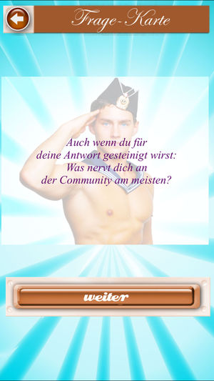 Das niveauvolle, lustige Gay-Spiel: 150x Diskussionsstoff für schwule Männer Beispielfragen: ● Welchen Teil deines Körpers magst du am meisten? ● Was muss passieren, damit du 100% Spaß im Bett hast? ● Dein Date bittet dich, an seinem Zeh zu nuckeln. Und nun? ● Mal ehrlich: Was hältst du von offen…