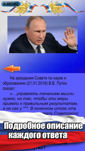 В этом приложении мы собрали и общеизвестные факты о В.В. Путине, и то, что, возможно, известно не всем. Вопросы викторины основаны на биографии В.В. Путина; его высказываниях на общественно-политические темы; о том, что известно о личных вкусах и пристрастиях нашего Президента.