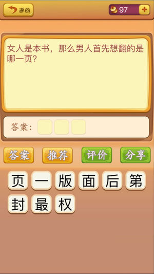 《脑筋急转弯-1000题》的世界里,只有想不到的,没有你看不到的。 -- 寓教于乐!经典必备! -- 每个脑筋急转弯都有相应的答案,内容趣味盎然, -- 老少皆宜,可以帮助你破除固有思维 -- 培养灵活多变的思维方式。 -- 精心挑选的脑筋急转弯让你其乐无穷。 -- 不断更新的题库让你感受到绵延不绝的欢乐。 -- 不会问题,可以直接查看答案获得帮助 -- 妈妈再也不用担心我的学习了。 -------------------------------------------------------------- -- 脑筋急转弯 -- 经典猜字游戏 -- 猜字达人必备 -- 考验你最强大脑 --…