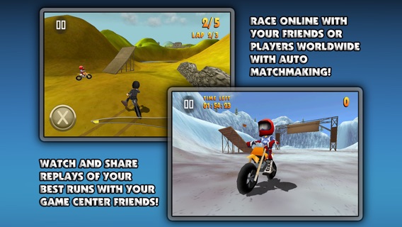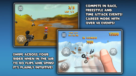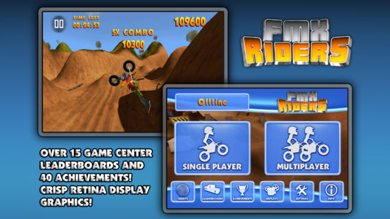 Join over 2 million players! #1 App in 19 countries #1 Game in 27 countries #1 Racing Game in 35 countries (November 6th 2012) FMX Riders is an Arcade Freestyle Motocross Racer loaded with features, the most important being it's FUN! Swipe across your rider when in the air to do flips and spins! It's plainly intuitive! Whether it's going through the World Circuit Career mode, challenging your friends with your best Replays/Ghosts, fighting your way to the top of the 15+ Leaderboards or upping your rank in the Online Multiplayer, FMX Riders is here to deliver! one of the best games in the App Store to date. (4.5/5) appadvice.com FMX Riders strikes a welcome balance between racing and stunt-work, as well as offering a robust selection of game modes that will keep you glued to the track for quite some time (7/10) pocketgamer.co.uk one of the best games I’ve played on my iPhone for a while – and certainly one of, if not the, best in its genre. (4.5/5) theportablegamer.com Overall FMX Riders is a huge amount of fun and offers a nice variety of things to do. With the addition of Game Center support for racing online this is one awesome game. (4/5) slinkystudio.info Key features: * Universal * Colorful Art Style * 4 Game modes : Race, Freestyle, Time Attack and Hotlap Time Attack * World Circuit Career mode with 9 Tours and over 40 events * Online Multiplayer via Game Center with Auto Matchmaking * Game Center Global Leaderboards and Achievements * Save and share replays with your Game Center friends * Intuitive Tilt and Touch controls * Retina Display Watch the trailer and more on www.fmx-riders.com Tips: FMX Riders was designed around Tilt to turn and Auto-acceleration controls from the start. They are the default and recommended control settings. You can however activate touch-to-turn and manual acceleration in the settings menu, but we strongly recommend giving the default controls a try. In any case you can adjust the sensitivity of your turning in the control settings. Tricks are hard to pull off! You should only launch tricks on the bigger jumps to make sure you can land them without crashing. Flips and especially spins are much safer on the medium and small jumps. The 3 Categories provide progressive difficulty. In 125cc, jumps and tricks are easier to land, whereas in 450cc you will have to complete your spins/flips/tricks before landing if you don't want to crash.