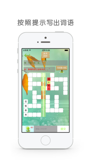 精彩填字 是利用空闲时间开发智力、拓展知识面的一款手机游戏,你可以自力更生独自完成题目,也可以和家人一起分享游戏的乐趣,还可以向朋友求助困难的问题,一起合作不断过关! 在闲暇的时候,消磨时间的同时还可以不断增长自己的知识! 玩法介绍: 1.通过给出的文字提示,写出词语。词语可能是成语、人名、普通词语。 2.完成率达到80%即可过关,并且开启下一关。 3.每天打开APP免费赠送答题提示。 4.和朋友一起,集思广益更好玩,更有成就感。