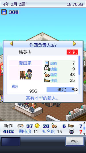 经营游戏公司,达成百万人气。 这是大幅强化后的升级版,新增了在自己公司内部开发游戏机的功能以及转职系统。 找寻优秀职员并对他们进行培养吧。 培养公司职员后,可开发的游戏种类和内容会变多。探寻人气组合,在新型主机上进行发售吧!不仅如此,程序员和音乐制作等与游戏相关的职业系统也将登场。 争取成为游戏界的霸者吧。 ---- 这是可以让人安心游玩的正版哦。 如果大家还是玩盗版的话,开罗君会哭的,说不定就没法继续做有趣的游戏了呢…… 想要了解Kairosoft公司其它模拟类游戏的信息,请访问开罗公园。 http://kairopark.jp