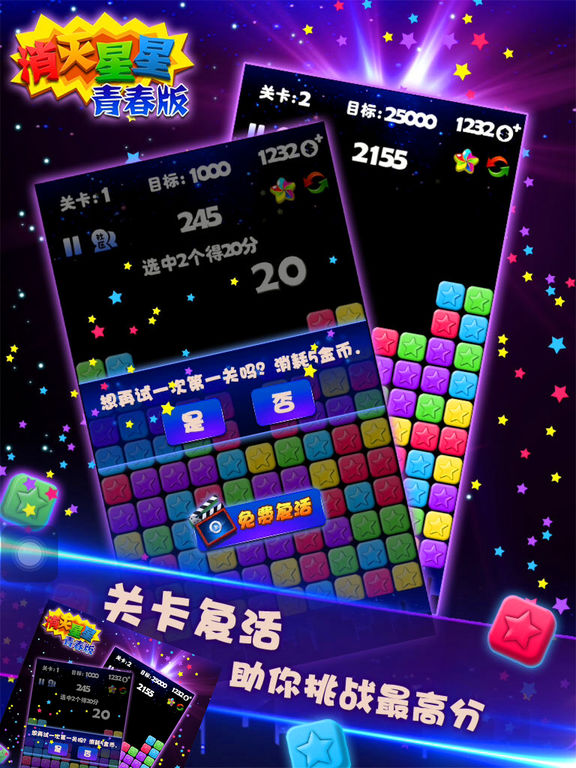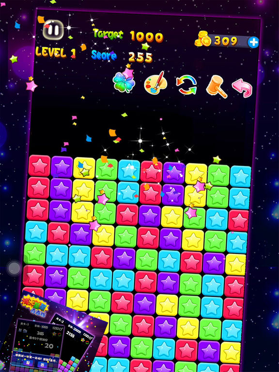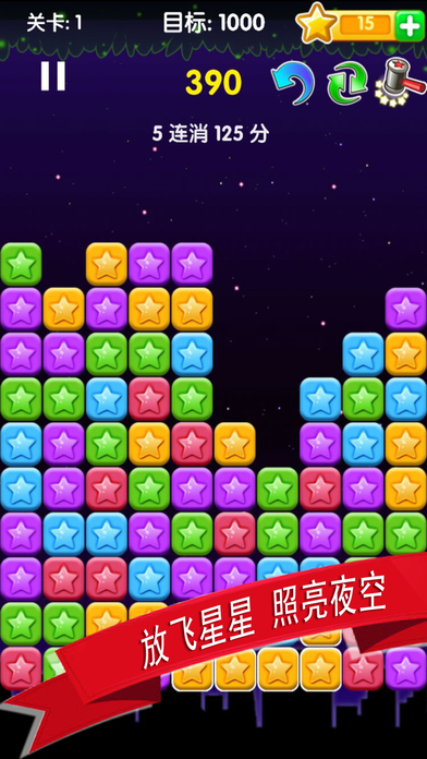 《消灭星星》全球拥有超过亿万玩家。为国内亿万玩家带来“全球超好玩的消除游戏!” 和传统的消除类游戏不同,本游戏没有时间限制,只要两个相同颜色的星星就可以消除,以关卡的形式进行游戏,每个关卡的分数需求累计增加。这款游戏设计根据消除,泡泡龙,天天爱消除,连连看,萌宠消消乐、开心泡泡鼠、鱼泡泡、泡泡堂、萌宠大作战、天天打泡泡、开心泡泡猫、全民泡泡龙等等多种游戏元素结合在一起,深受美女们,小孩子的欢心。 游戏虽然简单,但想要玩出很高的分数还是要耗费不少脑细胞的,拿PopStar!开动脑筋打发时间也是不错的选择。如果喜欢消除游戏的话,PopStar!消灭星星传奇版就更加不容错过了! 1、游戏主要通过触摸屏幕来实现各种操作 2、该游戏主要触摸操作模式为“点击触摸” 3、通过“点击”来进行按钮选择 4、通过“点击”两次同一处方块,来实现同样颜色方块的消除 消除方法是,点击颜色相同成块的方块或者星星,它就能被消除。同时消除的方块越多分值越高。你也可以尽量让所有的方块被消除,会有更多得分