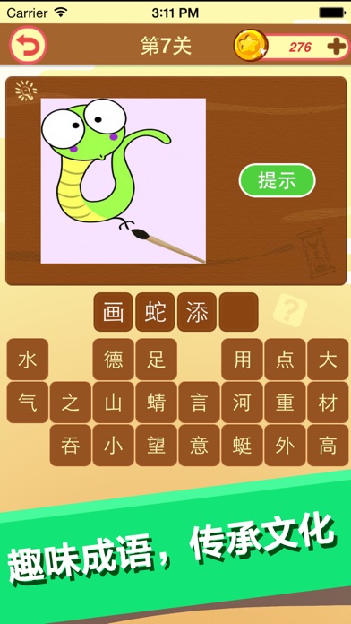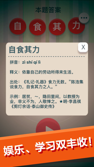 最牛猜成语是一款休闲益智游戏,它是综合了看图猜成语、成语消消乐、大意猜成语、记忆消成语、大意猜成语、开心成语、疯狂字中字、七个游戏于一体的疯狂猜成语游戏,是史上最全的一款成语文字小游戏! 最牛猜成语完美的将文字、学习和游戏结合深受年轻人、上班族、休闲老人、在校学生、老板等人的喜爱!是一款老少皆宜的中国文字游戏! 最牛猜成语模式多样化,从各个方面提高玩家的智力、反应能力、视力是一款极具教育意义的文字游戏! 在日常生活中,在休闲的时候,既可以享受成语多玩法的乐趣,还能学到知识,增长学问,提高记忆!是一款不可多得的休闲益智疯狂猜成语游戏!想要获得更多的生活趣味就来“最牛猜成语”!