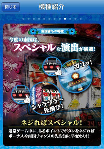 ----------------------- Ver1.0.1公開! ・サウンド関連の不具合を修正。 ・その他不具合を修正。 ----------------------- オリンピアパチスロアプリ第一弾登場! 「キュイン!」と鳴り響くボーナス告知音、パトランプ告知、そして伝説のバタフライランプ・・・多彩なる魅力によって、大ヒットを記録したパチスロ「南国育ちシリーズ」最新作が遂に登場! 4号機時代からの定番演出に加え、リール逆回転、ねじり機能など新たに搭載された演出も完全再現! 古くからの南国ファンも、現役スロッターも存分にお楽しみ頂ける内容です。 【POINT1】蝶が飛ぶ!あの感動を完全再現! 洗練されたグラフィック、リール制御、各種ゲームモードをはじめ、最大の特徴であるバタフライランプ・パトランプの各種演出を忠実に再現。あの「蝶が光り羽ばたく感動」を完全再現しました! 【POINT2】全19曲!南国サウンドを堪能! 南国育ちと言えば、忘れてはならないのが名曲と名高い南国オリジナルサウンド。 ゲームプレイ中に、ある特定条件をクリアしていくことで南国サウンドが次々開放!ミュージックプレイヤーとしても楽しむことができます。 【POINT3】実践にも役立つ! お好みの設定や環境を選択し、出玉、収支、プレイデータ等の各種データをグラフなどで分かりやすく研究できます。パチンコ店舗での実践に役立つ機能が満載です。 【POINT4】便利機能! ・オートセーブ機能によって、自動でセーブされるので電話が掛かってきても大丈夫! ・本体を傾けることで縦と横画面を自由に切り替えてプレイできます。 ※※※ インストールに失敗する場合 ※※※ アプリサイズが大きいため、端末に十分な空き容量がない場合は正常にインストールできない場合がございます。 その場合、端末の空き容量を増やして頂くか、PC上のiTunesで再ダウンロードを行い、端末に同期してアプリをインストールして下さい。 ※※※ 起動に失敗する場合 ※※※ 端末を再起動した後、再度アプリを起動してください。