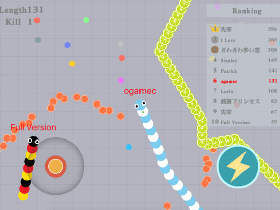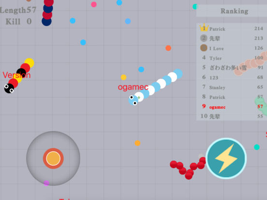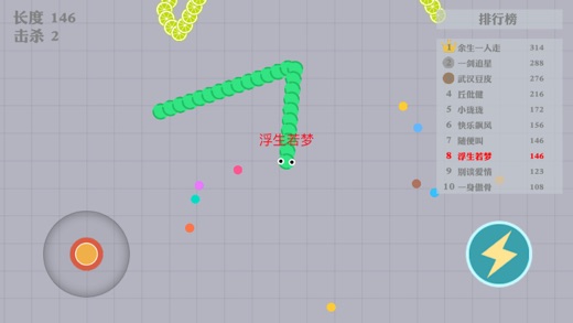 伙伴们,你们还记得小时候玩过的经典游戏贪吃蛇吗?现在已经完美的的化身为《蛇蛇大作战》啦~ (≧▽≦)/~,全新的游戏玩法等您来挑战哟! 这是一款超好玩的娱乐休闲竞技小游戏,在这款游戏里不仅是比拼手速,更考验您与众不同的策略!在贪吃蛇大作战的世界中,每个人在游戏最初的时候都是一条小小蛇喔,只有通过不断的努力才会把自己变得越来越长、越来越大,最终成长为贪吃榜排名第一的贪吃蛇喔O(∩_∩)O~ 游戏玩法 1.控制摇杆走位你的小蛇,吃掉地图上彩色的小圆点,或者攻击其他蛇蛇,要有技巧性的攻击,告诉你一个小秘密,合理使用加速按钮把其他蛇蛇围堵起来,被你围堵起来的蛇蛇无路可走撞上你的蛇蛇死掉后会掉出一堆食物哦~~~吃掉小圆点自己就会变长喔。 2.要注意!自己的蛇头碰到其他贪吃蛇的身体就会死亡喔,并且会产生大量小圆点。 3.长按加速键,用巧妙的走位让别的蛇蛇撞上自己的蛇身上,就可以吃掉他们啦。 最后祝伙伴们玩的开心,吃的开心,牙好胃口好,吃嘛嘛香O(∩_∩)O