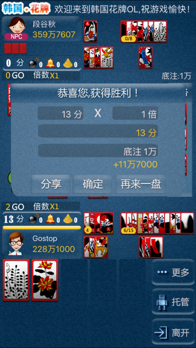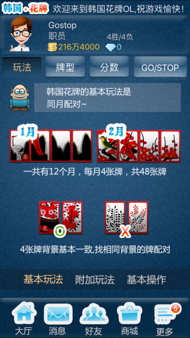 === 韩国正宗GOSTOP === 한국어,简体中文,繁體中文,English等多语言支持 让我们体验一下,原汁原味的GOSTOP! - 包含所有的GOSTOP规则 - 经过严格推敲的本地化 - 超级详细的帮助文本 - 包含效果音,中文男女配音 - 在线游戏,挑战各国GOSTOP高手 支持邮件 flybird2116@gmail.com