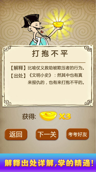 这是一款益智休闲成语学习应用,通过看图猜成语来学习成语,寓教于乐,开心学习成语解释、了解成语典故和出处,让学习成语从此不再枯燥。 猜成语汇集了上千个经典的成语,让你在汉字王国的海洋里尽情享受中国博大精深文化的熏陶,做一个真正的中华学霸。 您可以通过微信微博求助和挑战你的朋友们,看看谁是成语脑力达人。 游戏特色: 1、上千个成语关卡,寓教于乐,学习不再枯燥 2、支持分享,小伙伴们一起来学习