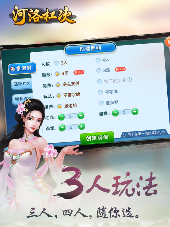 《河洛杠次》,最早在河南各地流传开来,称为“河洛杠次” 最地道的玩法,独创的杠次点炮胡,玩法更加全面,极具特色的本地配音,邀请好友快速网上约战,极速体验杠次带来的乐趣! 2017年本地玩家最必不可缺少的APP,还不快下载!赶紧一起加入,大家一起HIGH起来! 稳定安全的对局环境,让你和朋友一起愉快畅快的麻将,随时随地开始战斗!
