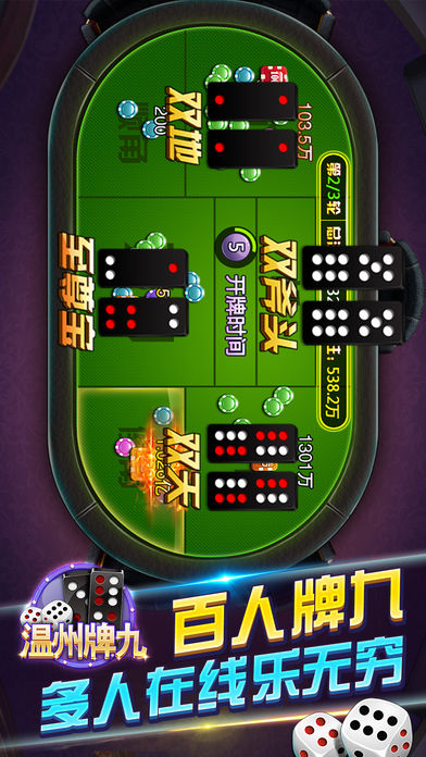 牌九是中国传统骨牌游戏的一种,玩法是依据两扇骨牌点数的不同组合,来比较大小,以决定胜负。下载游戏您就可在手机上尽情享受经典游戏带来的乐趣! 游戏特色 1、真人互动,游戏交友两不误 2、快速注册,一键开始游戏 3、海量金币领不停,缤纷奖品来就送 4、经典玩法、百人玩法,乐趣无穷