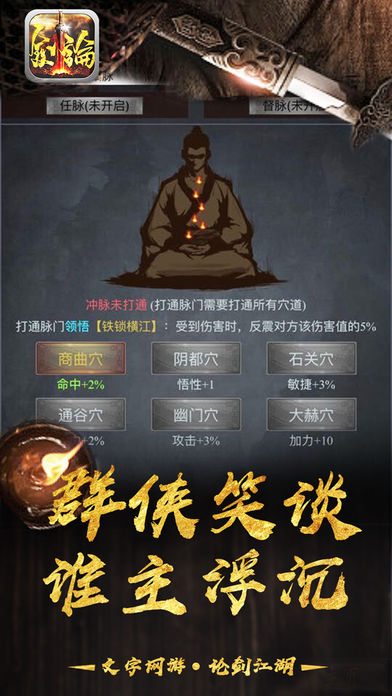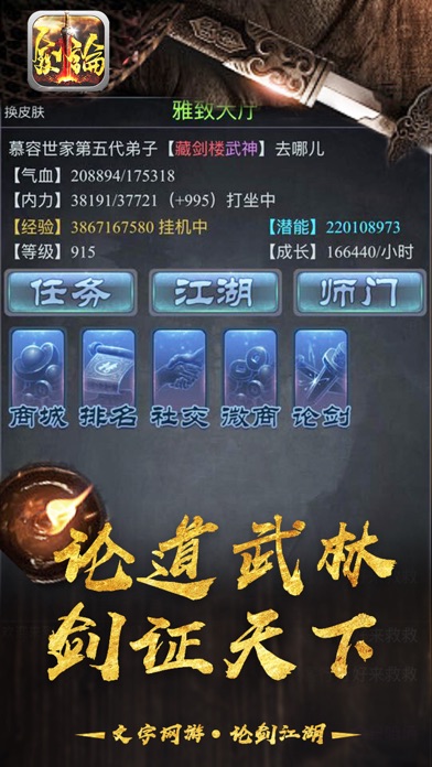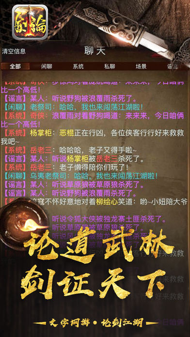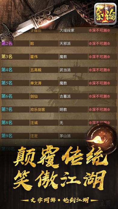 2016年次世代MUD手游大作压轴来袭!颠覆传统!纯文字战斗!经典武侠MUD再次重现!尝试5分钟,通过博大精深的文句所带来的无穷想象,进入极具沉浸感的武林江湖,亲身领略武侠小说描述般扣人心弦的恩怨情仇,让你再也放不下的武侠游戏! 经典武侠MUD震撼重现指尖屏幕! 最地道的MUD玩法完美继承情怀! 最熟悉的武侠人物在此生动还原! 最不凡的武侠绝学皆可传授习研! 最精彩的武侠剧情再次淋漓呈献! 仗剑执酒齐逍遥, 刀光剑影生死共。 江湖何处不相逢,以武比试论英雄。 【经典武学,精彩再现】 所有武侠小说中的经典人物与情节都会在此得到生动还原。在他们之间游走周旋的同时,还能学习属于他们的独门武功。集各家武学于一身成为盖世英雄将不再是梦想。 【细节丰富,超高自由】 游戏中充斥超丰富的隐藏地图、人物以及任务,在每一处的角落皆可遇上出乎意料之外的奇遇。时间、地点、人物、决定的不同,都可造成令人惊叹“蝴蝶效应”导致最终结果有所差异。 【社交互娱,欢聚享受】 有人的地方就有江湖,与以往单机MUD游戏乏味无趣不同的是,本游戏可容纳万千玩家同服游玩。玩家可化身成武林栋梁行侠仗义,亦可沉沦为祸世邪雄翻云覆雨,更能不问世事处事中立逍遥自在。正因每位玩家行事风格的不同,游戏的武林江湖方能风起云涌。 【完美继承 魅力依久】 将昔日独具魅力的MUD玩法完全继承,以数十万妙笔生花的精彩文句,通过行云流水的描述,将游戏的地图、人物、玩法、战斗以淋漓尽致的方式描述展现出来,交由玩家用天马行空的想象力来代入到风起云涌的非凡江湖。