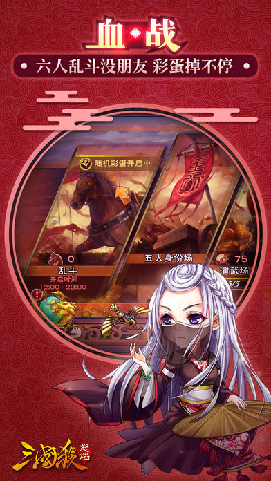 《怒焰三国杀》为知名游戏《三国杀》的正统新作,原班制作人马再次发力,新画风,新玩法,感受不一样的三国杀! 【全新特色】 1、怒气系统:每张卡牌在打出时,都可以消耗怒气产生全新的效果,激爽! 2、技能符石:简约不简单,搭配太好对手会瞎,武将不再千人一面,多变! 3、轻松幽默,五分钟上手,十分钟一局,轻轻松松来一句,畅快! 4、武将化身逗比萌将,北斗声优大献声,耳朵都要怀孕啦,惊喜! 【模式介绍】 1-1v1单刀会:双将实时切换,全新策略体验,单挑·竞技·爬天梯! 2-逍遥天下:有毒的剧情,烧脑的关卡,一本正经“撩”三国! 3-乱斗场:六人欢乐乱斗,没身份,没盟友,谁能活到最后?今天你五杀了吗? 4-3v3演武场:亲自控制主将,指挥两名AI边将对战,这就叫躺赢! 5-封魔塔:率领众多武将,逐层挑战强大的魔将,感受来自策划满满的恶意吧! 6-身份场:主·忠·反·内,经典的身份模式也有保留,偶尔情怀一下也不赖~ 【玩家趣评】 -从初中开始,玩了快十年三国杀了,终于等到官方出新作了,怒杀一出立刻连玩了好几个小时,完全停不下来啊!不说了,手酸…… -卧槽所有的卡牌打出都有动画,所有的武将用技能、挨打的时候都有动画,貂蝉挨打的时候特别好看,连弩你拿去,请答应我一下一下的把我打死好吗……武将皮肤就更厉害了,尤其是吕布的,不要问我为什么,这样给自己加戏真的好吗? -1v1和3v3很有特色,本以为和三国杀玩法一样,结果发现完全不同!!!1v1两个武将同时上场随意搭配,好组合超逆天,3v3简单粗暴狂打输出,这么好玩我根本看不见身份场的未来啊…… -我玩三国杀只玩单机,抽空就打一把AI身份场,最近有朋友推荐我来玩怒杀,发现还有PVE和爬塔这些单人机模式,非常适合我这种不怎么喜欢PVP的玩家。 【规则简介】 1、回合制出牌:根据不同关卡及模式,按规则依次行动,在自己的回合内,玩家需要完成摸牌、出牌和弃牌的过程。 2、游戏牌:分为基本牌、锦囊牌和装备牌。每类牌里包含了多种同类型牌,每种牌都源于一定的历史背景也有着独特的实战作用。 3、怒气:受到伤害时会获得怒气,怒气可以加强卡牌效果,如:伤害+1,弃对方一张牌等。 4、技能符石:武将上场前可随意搭配一个技能符石,好的搭配能起到意想不到的逆天效果,享受变化多样的对战乐趣。 【联系我们】 客服电话:0571-85209642 微信:怒焰三国杀(nuyansanguosha) 微博:@怒焰三国杀 QQ群:210785667