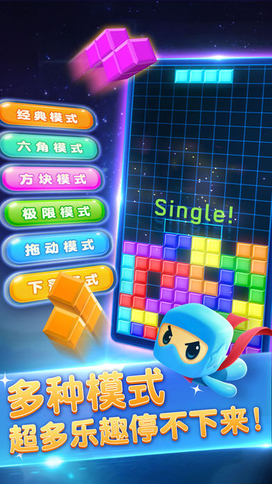还记得在红白机和小霸王上玩俄罗斯方块的快乐么?最经典的俄罗斯方块玩法现在与你重新见面了!感受最开始的快乐!和更多朋友一起重温童年! 游戏特色: 1.经典俄罗斯方块玩法,最经典的方块形状 2.全新的优化的界面,视觉效果清新舒适 3.增加了提示与多种玩法,内容更丰富,游戏更轻松 4.随时随地,打开即玩