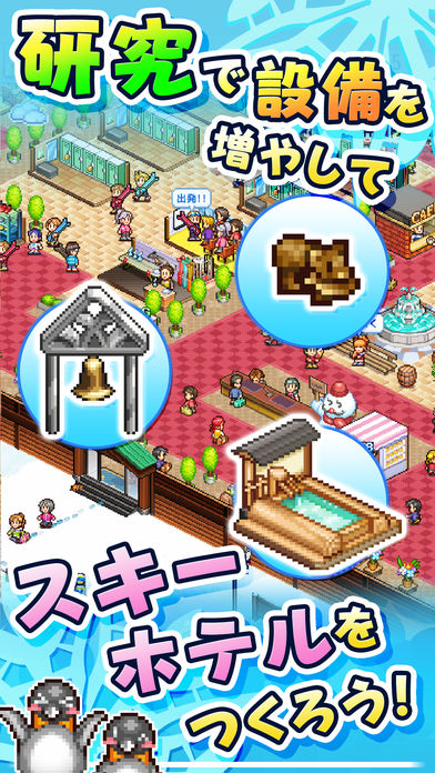 始めにあなたに与えられるのは、小さなスキーホテル。 そして、一面まっしろの大きな雪山です。 さあ、大自然を切り開いて、すてきなスキー場を作っていきましょう。 山の開拓で手に入れた素材を使い、施設を開発する事ができます。 新しい施設を配置すればその魅力に惹かれたお客さんが増えていき、スキー場の活気ある姿を味わえます。 ホテルの人気が出れば、売店やカフェで新商品なんかも作れるようになります。 ゲレンゲをすてきなコースに仕立てれば、お客さんの華麗なトリックが見れるかもしれません。 レース大会はスポンサーから貰った、アイテムを使って勝ち抜きましょう。 ジャンプ台に合わせて爽快にジャンプ! カッコよく勝利すれば支援者のおぼえも良くなって、後で貰える報酬がおおくなります。 目指すはスキーバブルの黄金期。 ランキングを駆け上がり、最高のウィンターリゾートを作りましょう。 -- 他のゲームは「カイロソフト」で検索してね。 http://kairopark.jp 遊んだことがあるかもしれないような無料ゲームや売り切りアプリが盛りだくさん! 2Dドット絵のカイロソフトゲームシリーズだよ。 最新情報はツイッターをフォローしてね。 https://twitter.com/kairokun2010