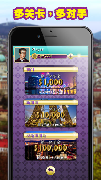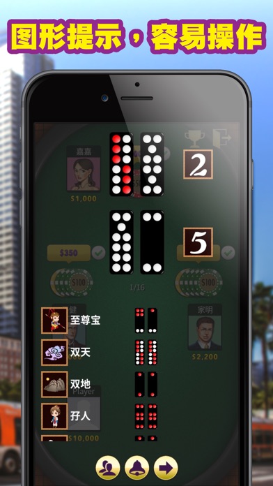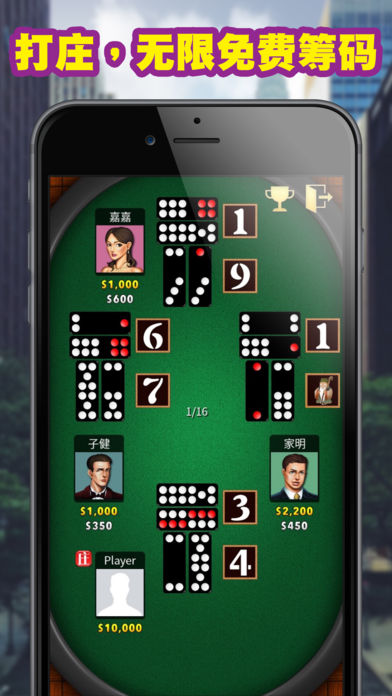 五分钟,玩十六铺牌! 快、快、超级快! 想用最有效快捷的方法学习牌九? 快安装这游戏,立即推牌! 快安装这个免费的牌九2游戏!牌九,又称排九,是一源自于宋朝的赌场游戏。规则十分简单,容易学会,但要精通,你得花一点心思去领会当中技术和策略。游戏中设有多个等级场景,包括澳门、新加坡、拉斯维加斯和巴黎。在不同的场景你会遇到不同的对手。你必须击败其他电脑对手来提升你的排名。我们有无限免费筹码,当你的余额少于$3,000时,我们会免费为你增加至$3,000,不限次数,真正无限免费。 如何玩牌九(排九教学) 玩家会有4只牌,分开两组,每组两张。玩家可自行将四牌两两搭配,然后两组牌朝下,小的点数横摆放在前面,大的点数直摆放在后面。然后每人与庄家比牌分胜负,必须前后都大于对方才算赢,前赢后输或前输后赢就是和局,前后都输即输。 ========================================== 重点特色: ========================================== - 完全无限免费筹码 - 华丽场境 - 自由选择多款头像 - 图像提示,帮助学习记忆 - 挑战20个电脑人工智能对手 是否已准备好学习和挑战牌九2呢?如果已经准备就绪,现在就开始征服澳门、新加坡,拉斯维加斯和巴黎各个场境和对手吧。 现在就安装,并免费的获得无限免费筹码,去无限次的玩吧! ! !