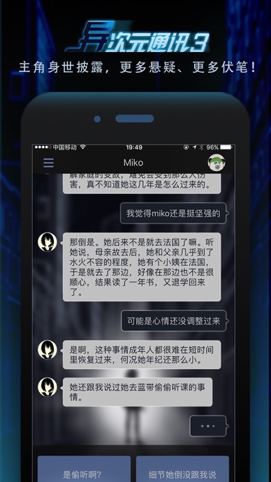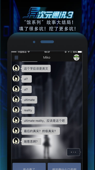 《异次元初章》为游戏的试发行版本,仅包含游戏的第1章。 《异次元通讯》为游戏的正式完整版本,包含游戏所有完整内容(目前为第1、2、3章及两个番外篇),以后的章节和功能更新都在此版本上进行,敬请下载。 首个TapTap预约满分游戏 2016年TapTap年度最佳剧情提名 App Store全5星好评 《异次元通讯》系列是一款体验新颖的文字AVG游戏,采用模拟手机通讯的方式达成玩家和故事主角的实时互动。 故事主角Miko无意中通过聊天软件和玩家相遇,在逃亡过程中只能跟玩家联系。玩家在与Miko的交流过程中逐步了解事件、协助解谜,熟悉Miko的性格,深入Miko的世界。 和千篇一律的美少女角色不同的是,Miko有着鲜明个性和独立人格,主人公需要像对待朋友一样,理解和尊重Miko的意愿,和她共同经历、共同成长。 在《异次元通讯1》和《异次元通讯2》中,玩家与Miko从陌生到熟悉,逐渐了解到事件的真相和Miko的身世。玩家陪伴Miko一次次冒险,天台惊险逃亡、解救Miko的父亲、经历神秘人的死亡、lo娘茶会的奇遇,除了完成任务,更重要的是逐渐了解Miko的性格、爱好、身世,与Miko的羁绊与日俱增。Miko直率却有点毒舌,态度不好但人却不坏,喜欢甜食,行动力超强偶尔也耍小聪明。最重要的是,她真实。她不像游戏女主角,就像是存在于你身边的女生。 《异次元通讯3》中,新的冒险又将开启。作为前两部故事的续作,《异次元通讯3》故事将更加悬疑,正片剧情容量大增,同时还有新的游戏角色登场与玩家互动。从美术馆、图书馆到博物馆,《异次元通讯3》将是前三章三部曲“馆系列”的大结局,从Miko父亲绑架事件到神秘人死亡事件的所有幕后秘密将会揭晓,玩家与Miko的冒险在这里告一段落。 同时,《异次元通讯3》也是新三部曲的开端,玩家可能会从另一个维度了解Miko,开启新的冒险。 正因为有了你的存在,才有了这段羁绊,正如Miko所说:“领我摆脱困境的,是你?还是根本只有我自己?” 异次元通讯project 《异次元通讯》还将继续更新后续剧情和功能,并将持续拓展其他形式、其他媒介的文化产品和游戏产品。 有建议、创意以及合作可以联系我们: 官方QQ:2454369924 官方邮箱:rekallstudio@qq.com