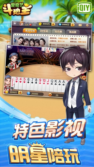 【游戏介绍】 全球独创明星影视主题赛事的棋牌游戏。 【游戏特色】 1、特色赛事:影视专场专属场景、任务、配音,热剧角色和你一起“耍”大牌! 2、玩法:支持经典三人、癞子、赛事等玩法,多种玩法任君选择 3、操作:智能选牌,一指选牌,简单便捷,手机斗地主就是这么轻松! 4、任务:精心为你定制各类特色任务,边斗地主边做任务,金币多多拿不停! 【全新的社交体验】 清新时尚的风格眼前一亮、活泼的角色形象和表情、丰富的魅力礼物打造轻松活泼的游戏氛围,玩游戏就能结交海量志同道合的好友哦!