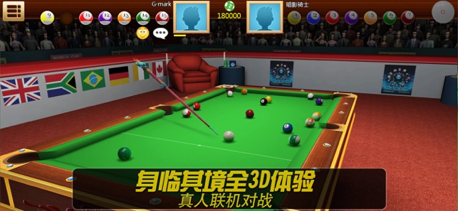 3D台球对战是经典的8球台球加上最新的游戏模式!从街头比赛开始参加挑战赛,不断成长,解锁更高级别的挑战赛,成为世界冠军! 3D台球对战百分百还原模拟了现实台球的玩法和场景,你可以和全世界的玩家比拼技艺,也可以和你身边的好友来上一局,还能参加擂台赛!40多支酷炫有型的球杆等你来收藏!成为VIP吧!赢得比赛登上世界榜单! 刺激的1V1对决 在此模式下和不同玩家决战,赢得比赛和奖金来解锁街头、俱乐部、名人、城市、国家和全球锦标赛!你能够成为世界冠军吗? 真人擂台赛 在游戏居室中称王称霸!你能够守住擂主席位吗?或者又赢得别人的擂台? 单人练习和双人游戏模式 和朋友在外感到无聊?一起玩台球对战…