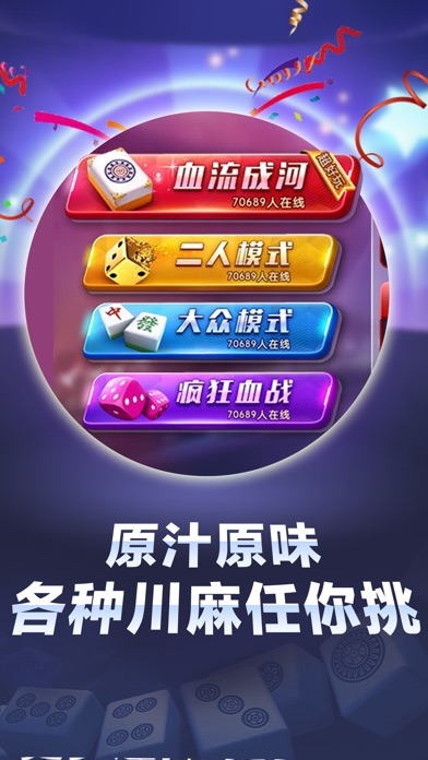 欢乐四川麻将是本年度超火爆的全民免费开房真人麻将游戏,让您轻松休闲移动娱乐。 血流成河、疯狂血战、大众麻将、二人麻将多种经典玩法等你来挑战 【游戏特色】 1.进入游戏无需注册,万人在线,一秒开桌,欢乐游戏不等待; 2.海量金币登陆游戏天天送,绿色安全公平免费畅玩; 3.独创疯狂血战玩法,1局可以胡10次以上,胡牌换张再胡,刺激无限! 4.3D精美游戏画质,看的让人舒心畅快,玩牌时仿佛身临其境! 5.炫酷装备系统,原来打麻将也可以很酷,打造独一无二的你!