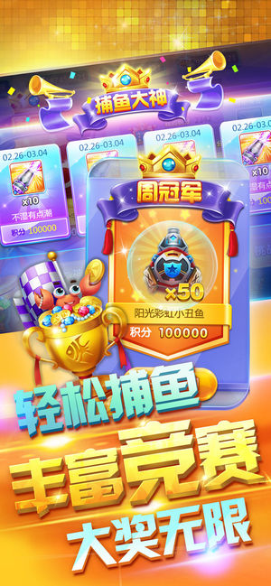 《捕鱼大作战》是一款以真实街机捕鱼游戏为原型的真人联网捕鱼游戏,还原经典捕鱼玩法,倍率、比赛、组队,多种休闲社交玩法满足同屏爆金体验!玩法多多,其乐无穷! 【游戏特色】 豪爽:每日签到奖励,连续登入奖励翻倍,免费奖励都这么刺激! 专业:经典模式、竞技场模式,全方位真实还原捕鱼玩法! 刺激:不仅有刺激的玩法,还有更刺激的活动! 真实:全面社交化的真人联网对决,与好友、土豪一起玩! 3周年,期待和您一起共享庆典!