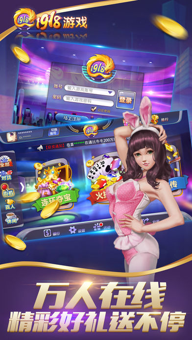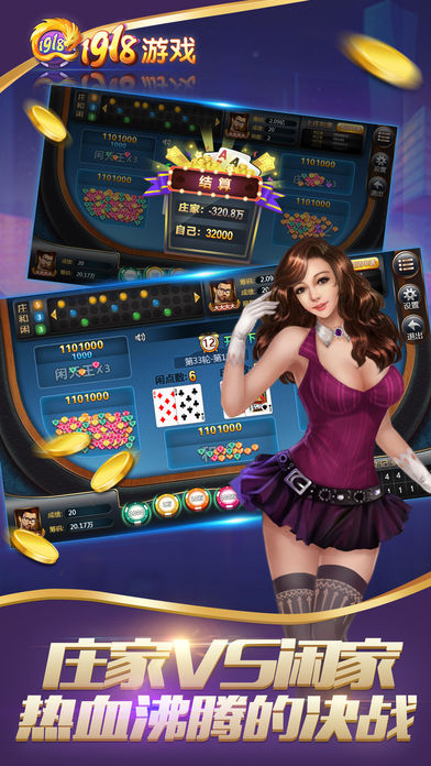 1918棋牌:2017最新的手机棋牌游戏,内含牛牛,捕鱼,水浒传,连环夺宝,百家乐等等,各种街机游戏应有尽有。全新玩法带给你不一样的游戏体验,各种游戏彩金中不停,让你嗨翻天。 游戏特点: 1,公平公正,全真人在线竞技,拒绝作弊,让你轻松体验到最真实,最刺激的手机游戏乐趣。 2,界面精美,专业美工团队打造,绝对惊爆你的眼球。流畅的动画效果,轻松的优美的音乐,让您更加放松愉悦的进行游戏。 立即点击下载,加入我们,体验最精彩的2017棋牌游戏。