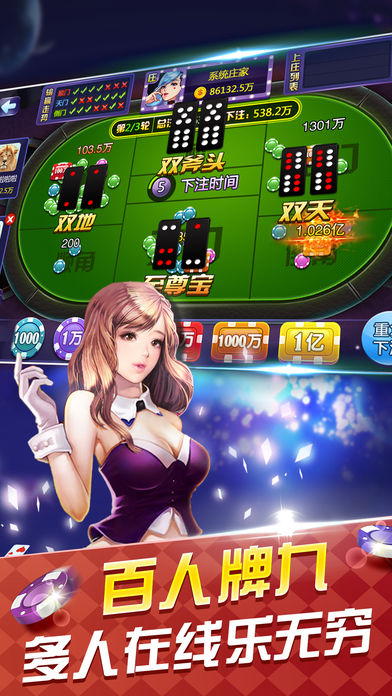 天九(牌九)是中国传统游戏的一种,基本玩法就是以骨牌点数大小分胜负。天九(牌九)又分大牌九与小牌九,大牌九是每人四张牌,分为大小两组,分别与庄家对牌,全胜全败为胜负,一胜一败为和局;小牌九是每人两张牌,胜负立现。下载游戏您就可以随时随地享受经典游戏带来的乐趣! 游戏特色 1.经典4张大牌九,玩法多变乐趣多 2.百人2张小牌九,干脆利落胜负立现 3.真人对局,公平公正,玩牌交友两不误 4.下载即送50000金币,每天还有海量金币送出