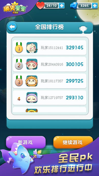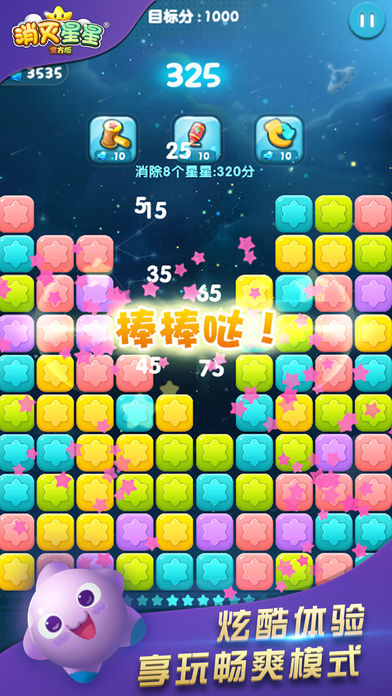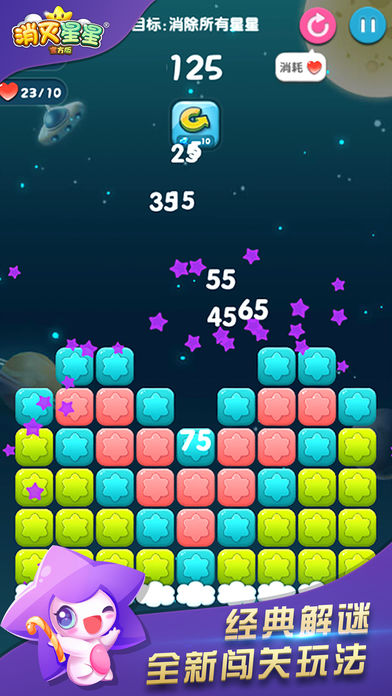 【游戏简介】 《消灭星星 》全新消除体验火热来袭。时隔两个版本,消灭星星华丽转身,游戏品质大幅提升,新鲜玩法层出不穷,一个新的星星强势回归。本版本在保持原汁原味的玩法基础上,升级了游戏画面,强化了游戏体验,增加多个新鲜玩法。画面、音效、玩法完美搭配;无穷关卡、给力道具、丰富奖励一个都不少。更新增排行榜系统,无论线上线下都可以与小伙伴们一起游戏,一起分享消灭星星的无尽魅力。 【游戏画面】 作为消灭星星的续作,画面再度升级:我们重绘了原始界面,使每个界面更加细腻; 我们增加了许多新的彩蛋,让你在不知不觉中发现色彩的绚丽; “快看那流星!”我们同样加入了许多新的特效,来实现你的美丽愿望。 【游戏玩法】 1.消灭星星玩法很简单,只需点击两个或两个以上颜色相同的方块即可消除。 2.游戏中可以通过巧妙的使用三个道具来冲击最高分数。 3.游戏失败后可以通过自动复活功能直接挑战当前关卡,再续神话的开始。 4.本次更新加入重磅玩法:排行榜系统。玩家在休闲之余更可与其他玩家互动。 【游戏特点】 游戏操作极度简单 玩法有吸引力,一旦上手,爱不释手 清新风格,休闲玩法,治愈游戏,消闲必备 精美画面、绚丽特效,史上最美的消灭星星 无穷关卡、给力道具,无限挑战 无关卡限制,自动保存,随时随地想玩就玩 自动复活功能,继续神话的开始 新增独有排行榜系统,与好友一起分享星星