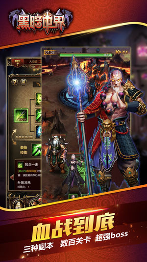 黑暗世界是一款具有高可玩性的打BOSS刷装备的单机游戏。 游戏特色: • 绝不重复的装备系统,强化、附魔、打造、镶嵌、合成,所有装备均可以通过刷怪掉落 • 255种装备属性词缀,89种技能属性词缀,所有装备全部独一无二 • 8大职业,丰富职业技能,玩法流派多种多样 • 78种符文之语,70种锻造材料,随意订制适合自己的极品神装 • 刷副本,刷秘境,获得大量传说碎片,兑换传说装备,尽情体验爆装备的乐趣 • 大量怪物,主线本,精英本,世界BOSS,秘境副本,总有挑战等着您 • 39级开启钓鱼台,离线钓鱼,获得大量日常资源,并且有可能获得极品饰品 • 50级开启世界的尽头,日常探宝,有几率获得极品…