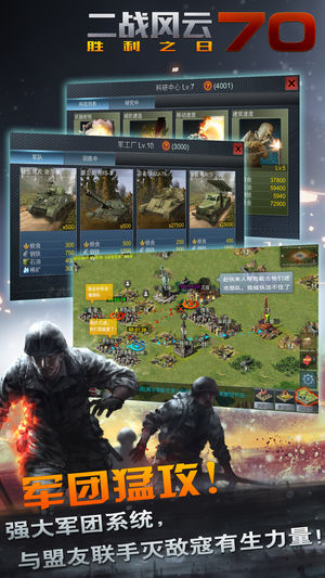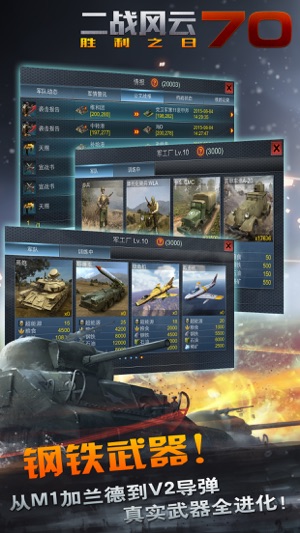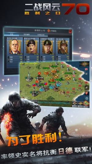 《二战风云》是一款社交战略网游!游戏以二次大战为背景,结合城市建造、资源经营、组建军队、军团养成等一系列玩法,供您尽情施展策略、比拼智谋,最终打 造一个属于您自己的强大帝国!首度重大改版更有个人免费加速及军团帮助功能助您快速发展。城内指挥作战、城外立决胜负,不同玩法一样激情!全球3500万二战玩家同场竞技,等您来战! 游戏特色: - 中国1600万精英玩家,全球3500万玩家 iOS畅销排行榜前十超过两年 - 玩家构成平均年龄32岁,男性98%。企业精英高管17% - 高素质玩家高端社交,大量线下聚会 - 大地图作战玩法,截击、设伏,战术丰富兵者诡道! - 免费加速功能,告别“蜗牛”时代…