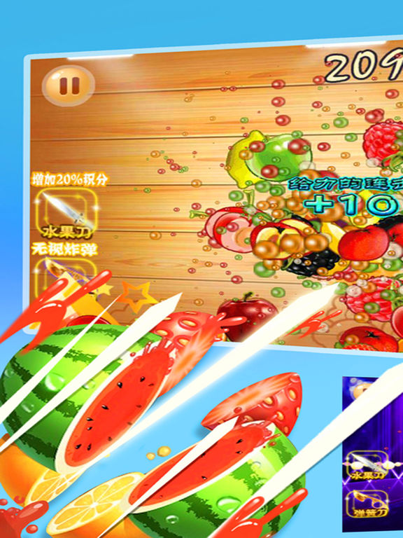 别犹豫,几秒钟,马上下载吧! 一款超好玩的游戏,清新可爱的高清画质, 玩法简单易上手,轻松滑动手指即可操作, 有惊喜有挑战,难度逐步升级,挑战你的极限, 最好玩的欢乐切水果切西瓜大战-花式削水果四溅! 是您平常休闲娱乐、打发时间的最佳选择, 绝对让您爱不释手! 最好玩的欢乐切水果切西瓜大战-花式削水果四溅! 屏幕上会不断跳出各种水果——西瓜、凤梨、猕猴桃、草莓、蓝莓、香蕉、石榴、杨桃、苹果、火龙果等, 玩家看到抛出的水果看准用手指在屏幕上移动划过去,就可以像忍者战士一样痛快地斩开水果了, 最好玩的欢乐切水果切西瓜大战-花式削水果四溅! 在它们掉落之前要快速地全部砍掉;不过除了很多被抛出的水果外,也会出现混杂着炸弹一类的东西,一旦切到就会引发爆炸。 最好玩的欢乐切水果切西瓜大战-花式削水果四溅!水果有大有小,小的水果比较不容易斩到。 切开不同的水果,会看到不同颜色的鲜艳果肉,而且像一些水分多的水果,各种颜色的果汁飞溅到半空,或者飞溅到墙上。 最好玩的欢乐切水果切西瓜大战-花式削水果四溅!游戏没有独特的配乐,只有斩开水果的声音和清脆的鸟叫声。