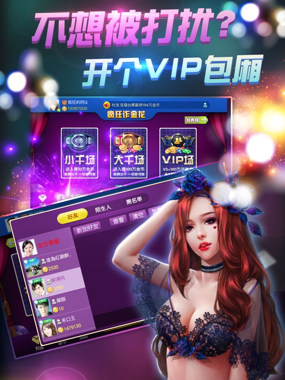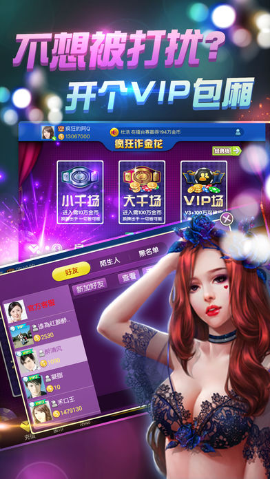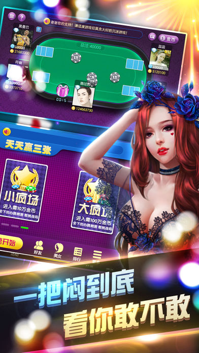 ◆最高端大气的皇冠炸金花电玩城! ◆百人大战,惊喜刺激赢大奖! ◆独具特色擂台赛,尽享王者风范! ■炸金花简介: 炸金花游戏包含 炸金花传统玩法经典场,独具特色的千王场、疯狂场、擂台场,玩家根据自己的实力自由选择喜爱合适的玩场和下注额度,与玩伴斗智斗勇,享受玩牌的乐趣!既有激情满怀,也有平淡愉悦,为休闲放松、调养精神的好游戏! ■游戏特色: 【金币丰富】新号启动金币多,每天登陆送金币多,在线游戏时忽闪忽闪金币又来了,万一手气差输了还领救济金币,尽管不是公务员,福利却是挺不错; 【经典玩法】经典玩法固定三张比大小,分初、中、高、至尊四级场,玩大玩小全凭玩家自己选择,消磨时间也罢,找点小刺激也罢,总有一场适合你; 【千王玩法】厌倦了固定的三张牌,可以试试出千换牌,散牌换出对子,对子换出金花,一切皆有可能,就看你招多不多啦,还可以禁止同桌比牌,要么要么的; 【疯狂玩法】牌好时想一把赢光对手?疯狂场可以满足你,一把输光或者赢得盆满钵满,感觉是不是太痛快?有大小疯狂场适应不同消费群体; 【公平竞争】想作弊?不好意思没机会,一切都是随机,机器发牌,才不认识你大叔、暖男、萝莉、熟女,或者是否VIP,规则就是:随机、随机、随机,重要的事说三遍。如果有爆发,一定是人品。