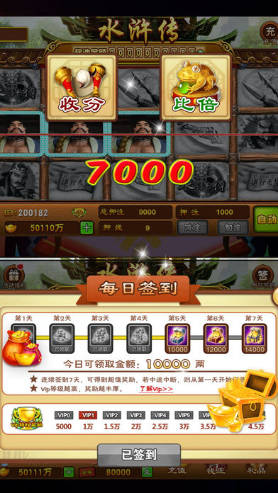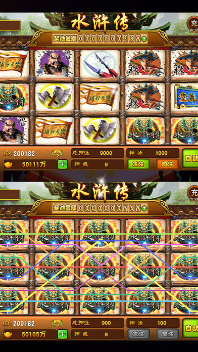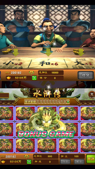 【传世·水浒传】BEST中国风街机游戏~是一款无限上分和下分的游戏!我们致力打造一款恒久永流传的中国街机游戏!游戏中拥有*丰厚实物*大奖,让你拿到手软!~爽的根本停不下来! √ 点击【更多】可了解游戏详情。 传世水浒传是一款九线十五转的街机轮盘的酸爽游戏,九线连线机的街机轮盘游戏源自赌博城拉斯维加斯的拉霸机游戏。 此游戏参照老虎水果机的模式,每轮中奖后都有摇骰子(色子)猜大小的游戏。另外,达到条件还能触发机制和水果老虎机一样的“小玛丽”游戏送奖,增加了游戏的趣味性和刺激感与众多街机等游戏相似。然而连线机游戏水浒传迎合了国内玩家的审美要求,完美的中国风界面,中国水浒传元素,更多更炫的中奖效果。 ································································ 【玩法介绍】 ◆街机水浒◆比大小◆大奖池◆奖券◆聚义堂◆对酒◆活动 ································································ 【街机水浒】 标志必须派彩线上,从左端至右边或右端至左端连续出现3个以上方可获得派彩。 【倍率介绍】 •中奖图标• •三连线• •四连线• •五连线• 铁斧 2倍 5倍 20倍 银枪 3倍 10倍 40倍 金刀 5倍 15倍 60倍 鲁智深 7倍 20倍 100倍 林冲 10倍 30倍 160倍 宋江 15倍 40倍 200倍 替天行道 20倍 80倍 400倍 忠义堂 50倍 200倍 1000倍 ································································ 【比倍介绍】 玩家点击‘比倍’进入猜骰子游戏,通过点击‘加’或‘减’调整比倍的单局押分,玩家可选择页面‘大、小、和’处进行押注。押注完毕庄家给出骰子结果。 派奖分别为,大2对(对子4倍),和6倍,小2倍(对子4倍),若玩家猜中游戏结果(2颗骰子点数总和)则得分,猜错则分数归0,游戏结束。 ································································ 【小玛丽介绍】 • 图标 • •次 数• •BONUS Game• 水浒传 3次 1次 水浒传 4次 2次 水浒传 5次 3次 ································································ 【大奖池】 --每日排行奖励-- --每周排行奖励-- •排名• •分红• •排名• •分红• 第1名 每日奖励的40% 第1名 每周奖励的22% 第2名 每日奖励的15% 第2名 每周奖励的10% 第3名 每日奖励的5% 第3名 每周奖励的5% 第4-10名 每日奖励的2% 第4-10名 每周奖励的2% 第11-36名 每日奖励的1% 第11-108名 每周奖励的0.5% ································································ 【奖券】 奖券可以在游戏中与官方兑换实物,奖励丰厚、实用,宝贝多多! ································································ 【聚义堂】 --昨日消费-- --昨日人气-- •排名• •分红• •排名• •奖励• 第1名 每日奖励的35% 第1名 30,0000两 第2名 每日奖励的20% 第2名 10,0000两 第3名 每日奖励的10% 第3名 5,0000两 第4-10名 每日奖励的5% 第4-10名 1,0000两 ································································ 【对酒】 要豪饮?拼酒量?在此决一胜负!“奖券”给你作陪!! ································································ 【活动】 每日精彩活动,金币奖品免费拿不停! ································································ 【意见反馈】 如果您在游戏中遇到任何问题,请及时与我们联系! 我们将尽快为您解决,给您营造良好的游戏体验! 玩家交流QQ群 : 630132553