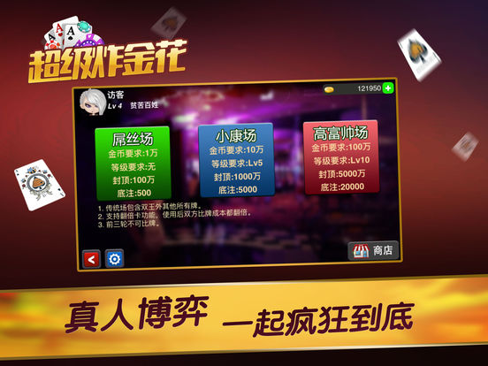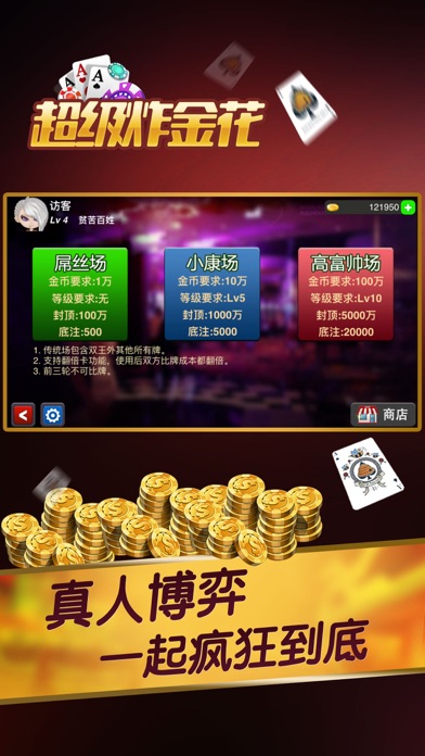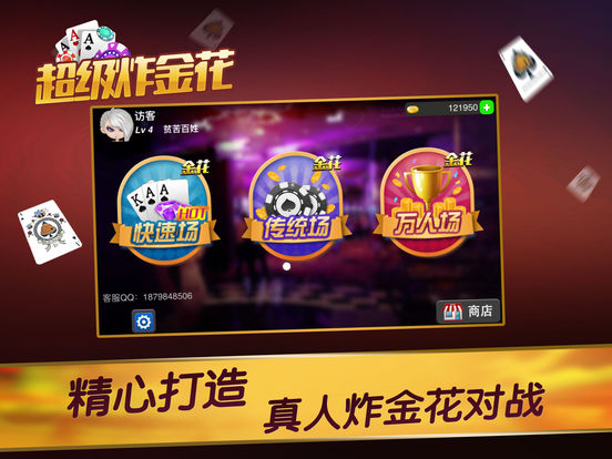 炸金花又名扎金花、诈金花,也俗称赢三张、三张牌,游戏每天免费发放多次在线奖励金币、大量救济金,供玩家尽情下注,肆意狂欢。 炸金花在线简介: 炸金花在线游戏集传统炸金花和万人场炸金花体验于一身,让玩家免费体验一把成为大富翁。 游戏特色: 1、游戏每邀请一位好友参与可获100000金币,成为VIP玩家每天登陆都可领取工资,最高每天可领取150000金币,同时可获得VIP权限,以及增加好友上限。 2、万人场牌局体验一把成为超级大富翁的快感! 3、集多种玩法于一身的游戏大厅,让你身临炸金花电玩城中,享受炸金花经典街机的无穷刺激。
