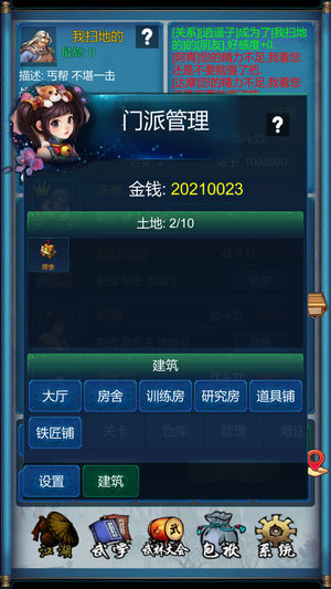 您扮演一位16岁初入江湖的少年。一开始您只有2000金币和5000的武功,可能会遭遇恶人下生死状,或者被人暗算身中剧毒,也可能遇到良师益友与您并肩作战。 只要您勤学武功,克服困难,您终将成为一代大侠! [概况] 您可选择去各大门派游历,途中可能遭遇各种突发事件。 请量力而为,约战武力较低的对手,以在下一轮战胜他,获得对方的金钱和武林秘籍。 得到武林秘籍和足够的金钱,您就可以好好修炼武功了。 江湖险恶,请注意照顾好自己,有病吃药,毕竟身体健康才是最重要的! 您大约能活到60岁左右,请珍惜每一天,好好奋斗。 [江湖] -战斗 属性系统、战斗系统 战斗基于攻击、防御等战斗属性,支持多阵营战斗 血…