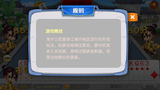 “同城游三扣”流行于浙江嘉兴地区的纸牌类游戏,尤其是在嘉兴海宁地区,更为流行,“同城游三扣”是一个四人玩的游戏,其中玩家在抢的庄家后,要对抗其余三名玩家,玩法刺激打法多样,深受嘉兴玩家的喜爱。也是嘉兴玩家茶余饭后最爱玩的棋牌游戏 “同城游三扣”游戏特色 [真人对抗,超震撼对抗快感] “同城游三扣”采用极具特色的地方棋牌玩法,激烈对抗,看看谁的实力强 [嘉兴经典玩法,正统规则] 嘉兴最正统的棋牌游戏,本地经典规则,同城游打造本地最具影响力的手机游戏。 [一键快速配桌,畅玩不停] 秒排配桌,无需等待,让你欢乐不停歇!