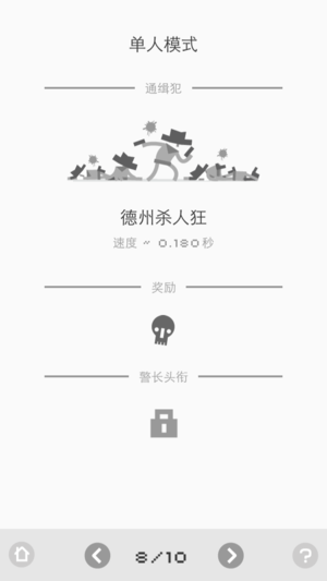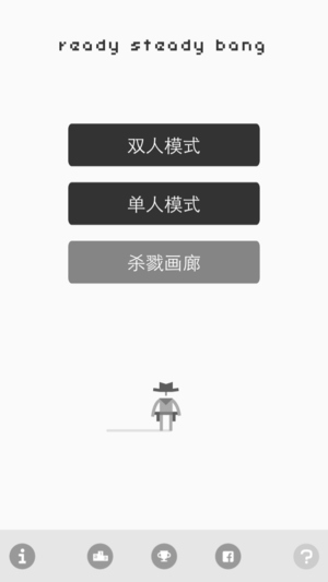 Ready Steady Bang 是一款制作精良、让人欲罢不能的快速射击决斗游戏。 玩家可在双人模式下,在同一屏幕上与好友进行面对面决斗,也可扣动扳机追击 10 名速度奇快无比的亡命之徒,在这一过程中还可以获得众多成就。 在游戏过程中一路过关斩将,可解锁 31 种独一无二的牛仔死状,作为战利品将他们展示在你的杀戮画廊里。 游戏可连接 Game Center,让你与全世界的男女牛仔们同场竞技。 你的拔枪速度够快吗?