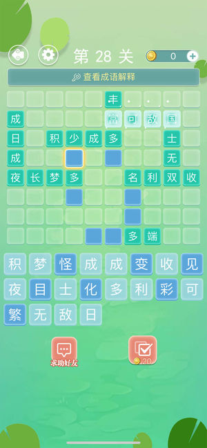 成语拼字接龙是一个经典的益智类游戏,规则简单,寓教于乐,再也不用担心孩子的成语储备啦~ 游戏规则: 成语拼字接龙是一个闯关类的游戏,从简单到复杂,一步步考验你的成语储备。游戏界面由不同的横竖空格组成,需要在空格处填入汉字,使之在横向纵向都是一个成语。 规则简单,却非常考验你的成语储备,赶紧来挑战看看吧!