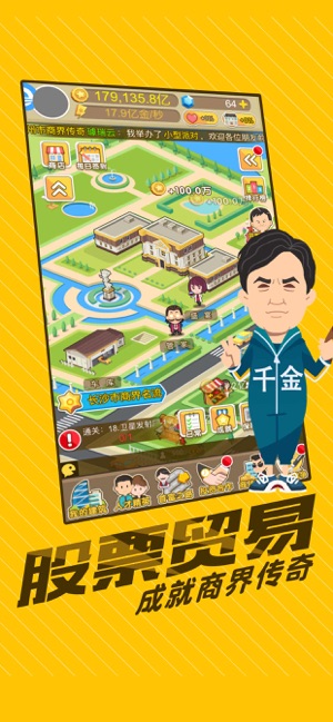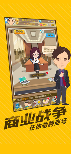 白手起家,成为全球首富吧! 一款依据现实生活打造的策略养成型手游,从小公司老板到国际商坛大鳄,商会联盟,股票增值,掌控商业帝国,争做世界五百强。 【游戏特色】 [巅峰总裁人生 玩转权利游戏] 点击领取属于你的总裁成长攻略! 全方位模拟现实创业架构与商业组成部分,真实体验总裁的职业生涯,升职加薪,出任CEO,迎娶白富美,走向人生巅峰! [出游盛宴 邂逅名媛成佳话] 开启环球旅行,漫步浪漫国度。出水芙蓉般的邻家少女,国色天香的富家大小家,自有风韵的轻熟女强人……中意哪一款?烛光摇曳,与红粉佳人对饮三杯,温床震颤后喜得贵子继承亿万家业续写辉煌! [谈判专家 喋血商战拔头筹] 各大商界精英尽归麾下…