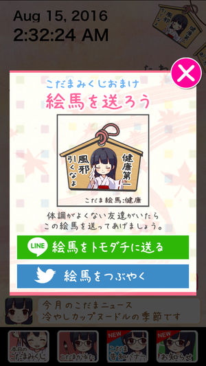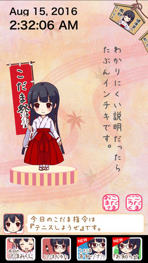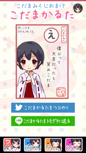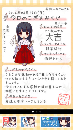毎日にちょっとだけ大吉を! 初詣のおみくじの結果はともかくとして、こだまみくじの方でも大吉がでるかチャレンジしてみてください! <こだまみくじとは?> こだまみくじは「おみくじ」です。 もちろん毎日大吉がでるとは限りません。 運が悪ければ大凶になってしまう日もあるかも知れません。 結果はともかくとして1日1回ちょっとした時間にチャレンジしてみてはいかがでしょうか? ラッキーパーソンを探すのもよし、今日のおまじないを実践してみるのもアリです。 友達や恋人とどちらの結果がよかったか勝負するのもいいかも知れません。 ◆こだまみくじの主な機能 ①名前と願い事に応じておみくじの結果がかわります…