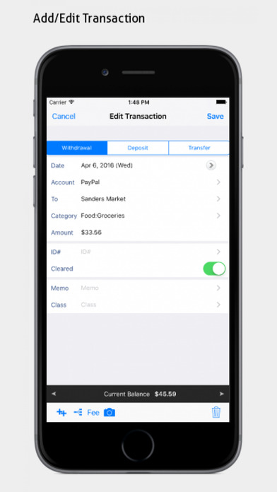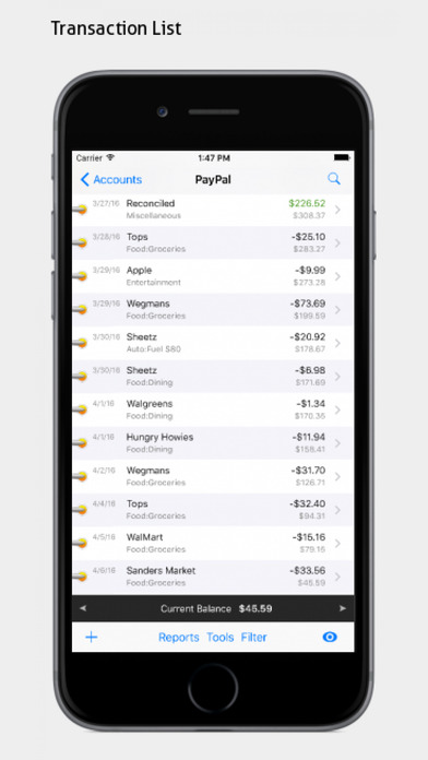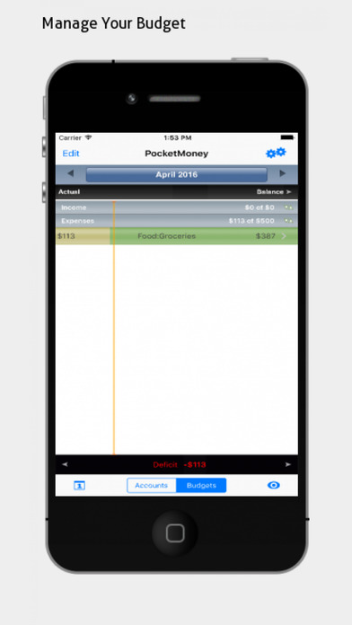 Also check out PocketMoney 2 for even more features! Need to track your finances on multiple iPhones, iPads, iPods, other OS's, or desktops? PocketMoney can do that, too. Sync multiple iOS or other OS's devices together over Wi-Fi or to the PocketMoney desktop app on OS X, Windows, and Linux (www.catamount.com). [SUPPORT: e-mail support@catamount.com. We can't help you if you post your issues as reviews.] The system is simple, and a minute a day using PocketMoney will help you navigate through the pitfalls of the current economy. ** Start by entering all your income and expenses as they happen across multiple accounts such as credit cards, savings, and checking accounts. PocketMoney can track thousands of transactions through many years of financial data with no performance loss. Transactions can be split across multiple categories, transferred across accounts and can also be scheduled to occur at regular intervals. ** PocketMoney makes this really easy by remembering previous transactions and auto-completing them as you type. ** Analyze your overall financial situation by using the built-in reporting features of PocketMoney. Charts can help you visualize overspending and target areas to cut back. Furthermore, your data can be exported to desktop applications such as Microsoft Money and Excel. ** If you use Quicken or MS Money, then you can export your desktop data to PocketMoney, enter data on the road, then export changes back to your desktop app via QIF files. (Quicken Essentials doesn't support QIF exports/imports.) Features Include: Accounts ======= - Unlimited number of accounts and transactions - Accounts include credit cards, checking, overdraft, savings and more - Proven performance and responsiveness - Repeating transactions with complex logic - Autocomplete transactions - Splits and Transfers - Reconcile and rollup your accounts. - Photo receipts - Current, future, cleared balance displays - Customized account ordering, grouping and graphics - Customized transaction entry preferences - Custom filters Syncing ====== - PocketMoney Sync Client - sync your finances over Wi-Fi to PocketMoney for Desktops (www.catamount.com for OS X, Windows, & Linux versions). - PocketMoney Sync Server - (Optional Add-on) -keep your data in sync over Wi-Fi between multiple iOS devices without the need for PocketMoney for Desktops. Budgets ======= - Income and expense budgeting - Daily, Weekly, bi-weekly, monthly, bi-monthly, quarterly, semi-annual, and annual budgets - iBeam to show current location of budget period - Budget bars for each category Reports and Charts - Custom reporting for Accounts, Categories, Class and Payee - Charts (Optional Add-On) - Net Worth, Cash Flow and Category/Payee graphs - Custom reporting and charting periods - Print transaction register, receipts, and report details to AirPrint compatible printer Interoperability ========== - Email, web browser and SyncDocs backup/restore - Keep partner in sync by emailing transaction to them. - Transaction and photo sync between multiple iPhones - Import - TDF, CSV, QIF, OFX/QFX - Export - TDF, CSV, QIF, OFX/QFX - PocketMoney’s iReceipt open standard allows other applications or websites to post transactions directly to PocketMoney to eliminate redundant data entry. (iReceipt supported by MPG, CheckPlease, BillMinder, and others) Usability ======= - Multi-currency - Multilingual (15 different languages) - Password protection - Transaction search - Themes, Fonts and colors - Visually Impaired friendly - Badge display for overdrawn accounts