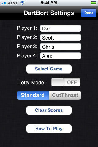 Score keeper for games of darts. Cricket, all 01's, and 5's. Drag darts from a player's name to the area hit on the board and DartBort will automatically keep score. Double-tapping a player's name enables / disables them, so this app can be used to accurately keep score with 1-4 players or teams. Undo button for accidental scores. More games to be added in the future and upon request. Visit danjabbour.com/dartbort to leave comments and see a demo.