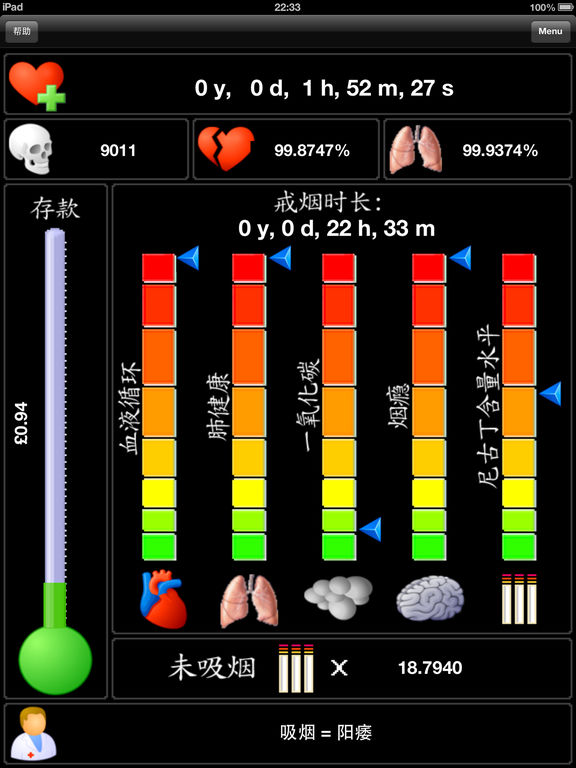 原始戒烟软件—My Last Cigarette(我的最后一根烟),现已全新升级为iOS和OSX专用戒烟软件,和它一起坚持戒烟吧。自2000年以来My Last Cigarette已帮助数千名吸烟者成功戒烟。如果您想认真戒烟的话,那么此款应用程序可让一切改观! My Last Cigarett功效显著! 只需输入您的吸烟习惯和个人详细信息,然后您就会看到各种指示器显示寿命延长、血液循环及肺功能的改善、存款及更多方面的预期值。超过10种不同的显示数据随时通知您,让您戒烟动力十足。适用于iOS的My Last Cigarette有助于抵抗致命烟瘾重犯已得到验证。该应用程序受益于针对吸烟的有害性进行的多年医学研究,是戒烟的重要工具。通过透视您的健康改善状况,从一开始就让您感受到意志力增强且信心坚定。您一定要亲自检验一下这些客户评价。 特点 《读者文摘(美国版)》推荐产品 统计信息实时更新,每秒更新一次! 尼古丁含量读取 预期烟瘾读取 所有计算均根据最新的医学知识和统计数据进行。 每日励志宣言或医疗事实。 每日图片/图表。 每日励志消息 您血液中的一氧化碳浓度 预期延长寿命读取 不吸烟时长读取 未吸香烟根数读取 戒烟前后患心脏病的风险比较 戒烟前后患肺癌的风险比较 省钱 预期血液循环改善 预期肺功能改善 戒烟后死亡几率读取 根据个人从前的抽烟习惯读取数据且每秒更新一次。 专为iPhone,iPad和iPod Touch设计的通用应用程序。无需重复购买。 真实的客户主动评价 请参阅评价。成千上万的人已用我们的应用程序成功戒烟。