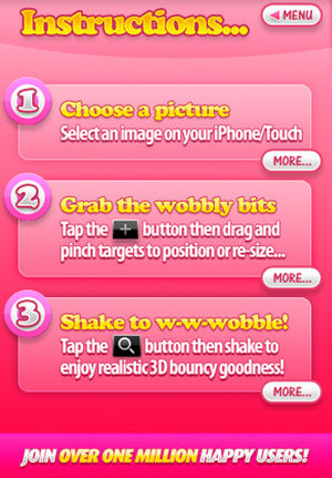Wobble Anything on your iPod or iPhone :: Pick a photo, add targets, shake & magically the bits realistically jiggle. :-) ★Blow to Wobble★MultiTouch Wobble★Over a Million copies sold★3D with Red/Blue 3D Glasses★Sharing★ ----What Wobble Does:---- - Select a pic from camera roll - Add Wobble targe…