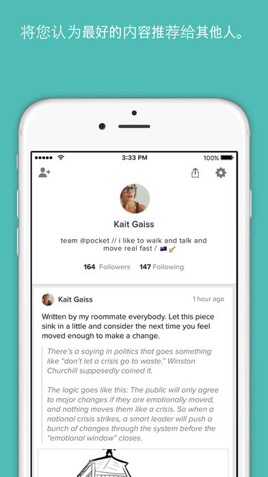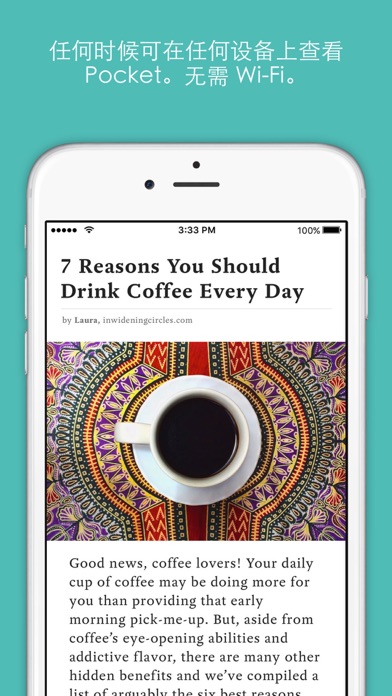 使用 Pocket,您可以快速保存、发现和推荐网络上最吸引您的故事。 -- 保存供以后查看: 下次看到您希望以后再读或再看的文章、视频或链接时,只需将它们保存到 Pocket 即可。它可以在手机、平板电脑和计算机之间同步,这样您可以随时随地,甚至可以在脱机的情况下查看这些内容。 您差不多可以从任何位置将内容保存至 Pocket,包括您的计算机、Safari、电子邮件以及 Facebook、Twitter、Flipboard 和 Feedly 等您喜爱的应用程序。. 漂亮的阅读体验: Pocket 布局干净且方便观看,不管您要阅读和观看什么内容,都不会被分心。您还可以根据自己的阅读风格自定义 Pocket。 发现您会喜欢的故事: 注意 Pocket 以及您关注的用户的精心推荐,快速发现您会喜欢的新故事。 推荐您的 POCKET 中最好的内容: 向您的朋友和粉丝推荐您的 Pocket 中最有趣的故事。 同时还有: •无限存储空间 •方便快速整理的标记 • 可以听文章的文本到语音转换功能 • 使用针对 Safari、Chrome 和 Firefox 的 Pocket 桌面浏览器扩展插件,点击一下即可保存 -- “安装 Pocket,就不用再通过电子邮件向自己发送链接了。”- The Verge “有了 Pocket,在地铁里也能阅读了。在上下班的路上,不会因为无法连接到互联网,Safari 页面刷新就停滞不前,所以你不会看到一个让人绝望的空白屏幕。”- Slate --- 升级到 Pocket Premium,体验更强大的 Pocket(月费 USD $4.99,年费 USD $44.99): • 永久存储库,为所有保存的项目保留个人副本 • 支持全文本搜索,可以找到列表中的任何内容 • 方便快速整理的建议标记。 价格可能因您所在位置而异。订阅费可通过您的 iTunes 帐户从您的信用卡扣取。除非您在当前订阅期到期前至少提早 24 小时取消,否则您的订阅将自动续订。要终止订阅,请禁用自动续订,当前订阅期到期后即终止。取消订阅不能即时生效。对于未使用的订阅部分,不得要求退款。 Pocket 隐私政策:http://getpocket.com/privacy Pocket 服务条款:http://getpocket.com/tos