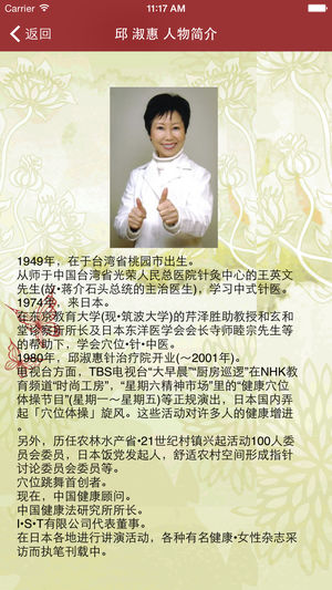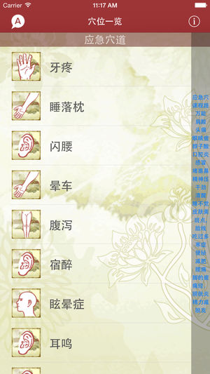 * 在于AppStore销售量第一名的应用软件(连续10日) 众所周知,穴道按摩健康法是东洋医学的健康疗法。所谓「穴道」是按照您的症状,介绍穴道按摩的位置和刺激方法。同时,我们还为您准备了眼疲劳,肩酸,减肥等方案。 症状一览 牙疼,睡落枕,腰扭伤,晕车,腹泻,宿醉,眩晕,耳鸣,吃得过多,肩酸,头痛,眼的疲劳,脖子酸,口腔炎,感冒,鼻子堵塞,压力,干劲, 困倦,失眠,肌肤美化,皱纹松弛,脸线,防止过量饮食,寒症,便秘,减肥,腰痛 过敏性肠综合症,痔,脚的疲劳・浮肿 ※以下是收费的穴位: 痛经,月经不调,膀胱炎,提高精力,脱发 方案一览 户外按摩方案,电脑疲劳(眼,肩膀)方案,电脑疲…